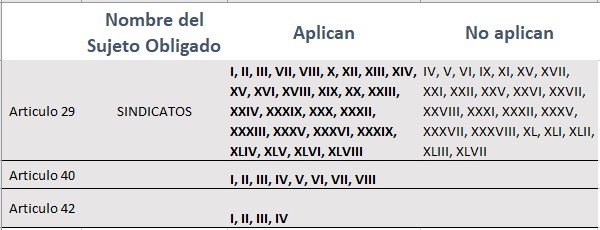 Artículo 42.- Los sindicatos que reciban y ejerzan recursos públicos deberán mantener actualizada y accesible, de forma impresa para consulta directa y en los respectivos sitios de Internet, la información que les resulte aplicable del artículo 29, y 40 del presente ordenamiento y la siguiente: